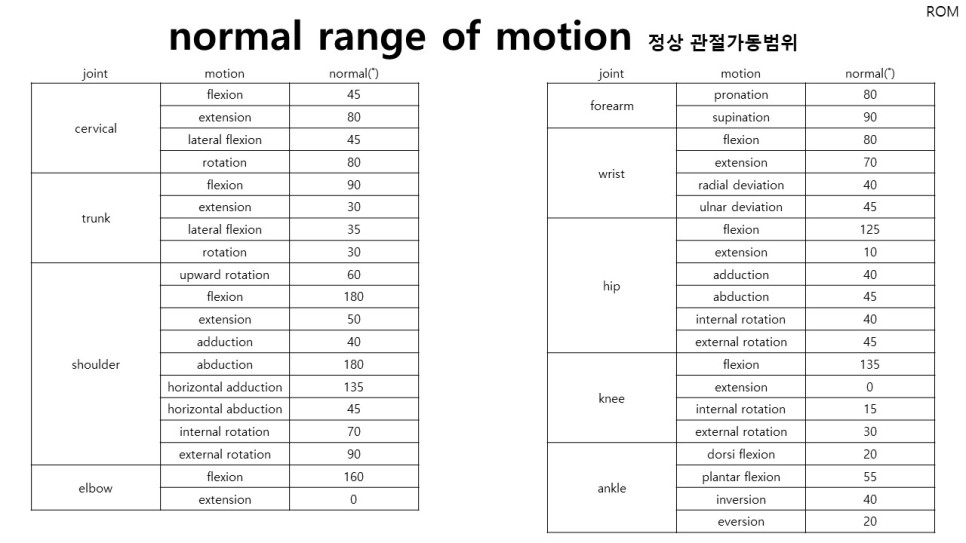 이렇게 관절(joint)은 움직임과 밀접한 관계를 가지고 있으며, 그로 인해 일상생활에서도 관절 가동범위(range of motion)에서의 정상 범위(normal range)는 반드시 필요한 요소 중 하나입니다. 이러한 능력이 불충분하거나 과다할 경우, 서로 다른 관절(joint) 사이에서 비정상적인 협응(coordinatio)과 마찰(friction)이 발생됩니다. 이것은 다양한 방법을 통해서 확인할 수 있는데, 관절 가동범위(range of motion) 자체에서 수행할 수 있는 방법이 끝느낌(end feel)을 확인하는 방법입니다.