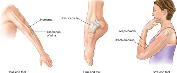 팔꿉관절(elbow joint)과 대조할 수 있는 관절(joint)인 무릎관절(knee joint)을 살펴보자면, 무릎관절(knee joint) 굴곡(flexion) 시의 끝느낌(end feel)은 팔꿉관절(elbow joint) 굴곡(flexion) 시의 끝느낌(end feel)과 유사합니다. 두 경우 모두 최대 굴곡 범위(maximul flexion range)에서 더 증가되는 굴곡 범위(flexion range)를 표층(superficial)의 조직(tissue)들이 막고 있기 때문입니다. 하지만 무릎관절(knee joint) 신전(extension 시의 끝느낌(end feel)과 팔꿉관절(elbow joint) 끝느낌(end feel)은 조금 다릅니다. 팔꿉관절(elbow joint) 신전(extension)에서의 끝느낌(end feel)은 뼈(bone)와 뼈(bone)와 잠겨진 상태(locking)에서의 단단한 끝느낌(end feel)이지만, 무릎관절(knee joint) 신전(extension)에서의 끝느낌(end feel)은 인대(ligament)와 같은 조직(tissue)들의 신장(lengthening)으로 더 증가된 신전 범위(lengthening range)를 제한하고 있기 때문입니다. 두 경우 모든 단단한 끝느낌(end feel)이 들지만, 앞서 설명한 이유로 인해 무릎관절(knee joint)보다 팔꿉관절(elbow joint)에서의 신전 끝느낌(extension end feel)이 더욱 단단한 느낌을 줍니다.