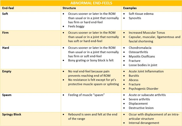 이외에도 끝느낌(end feel)에 대한 압력(compression)을 가하는 데에 있어서 관절의 튕김이 너무 빠르거나 너무 늦는 경우에도 비정상적인 끝느낌(end feel)에 해당됩니다. 이것을 정확하게 비교하기 위해서는 관절 가동범위(range of motion) 검사와 함께, 좌우 검사를 동반해야 합니다.