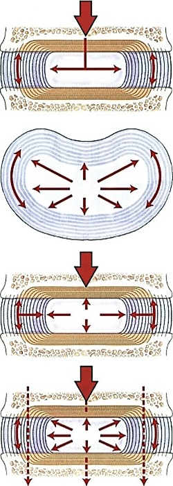 척추 디스크(spinal disc)는 또한 중력(gravity)으로부터의 압박력(compression), 그리고 다양한 움직임으로부터 전해지는 스트레스를 분산하고 흡수합니다. 수핵(nucleus pulposus)은 앞서 소개한 구조적인 특성상 약간의 탄력성(elasticity)을 가지고 있습니다. 그래서 젤리로 비유하기도 하는데, 이것은 수많은 단단한 척추(spine)와 비교적 탄성(elasticity)을 충분히 수용하지 못하는 인대(ligament)를 대신하여 기능하게 됩니다. 그러니 척추(spine)를 보호(protection)하고 움직임을 개선하는 데에 있어서 척추 디스크(spinal disc)가 중요시 여겨지는 것입니다.
