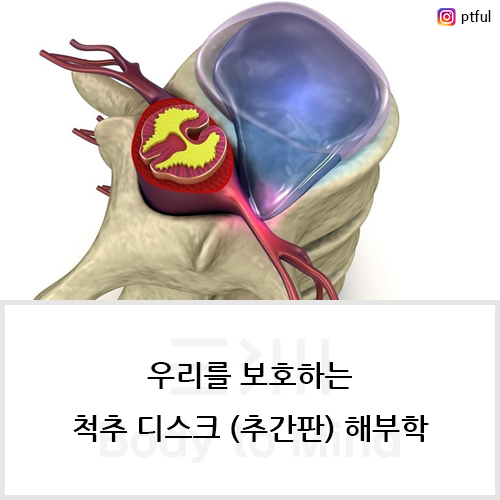 척추 디스크(추간판(intervertebral disc))은 척추(Spine)를 구성하는 구조물(structure) 중, 척추(spine) 그 자체를 유지하고 근육의 기능과 움직임의 양질에 있어서 빠져서는 안 될 구조물(structure)입니다. 많은 사람들이 척추 움직임(spinal movement)을 동반한 운동을 즐기고 있으며, 또 많은 사람들이 척추 움직임(spinal movement)을 동반한 질환(disease)을 가지고 있습니다. 이것은 다른 부위와는 다르게, 운동 경력이 많든 적든, 혹은 근육이 많든 적든, 목(neck)이나 허리(low back)를 쉽게 다치고 아파하거나 불편해하는 것을 쉽게 찾아볼 수 있습니다. 이러한 이유는 추간판(intervertebral disc)을 포함하여 척추 자체의 구조(spinal structure)를 반영하지 못하는 생활환경과 운동들에 의할 것이라고 예상합니다. 그러니 운동을 하든 하지 않든, 누구에게나 척추(spinel)와 척추를 이루는 구성물(spinal structure)들에 따른 지식과 움직임이 필요하다고 여겨집니다.