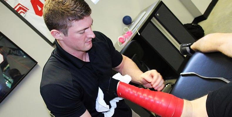 랩핑(wrapping)을 빠르면 빠를수록 좋습니다. 해당 지점으로부터 혈류(blood flow)가 제한되기 때문에, 랩핑(wrapping)이 빨라야 플로싱 트레이닝(flossing training)의 시간이 상대적으로 여유롭습니다. 트레이닝(training)은 약 1~2분간 수행할 수 있지만, 대상자의 상태에 따라 변화될 수 있습니다.