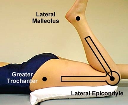 그러한 방법으로 수행한 검사가 위의 사진과 같습니다. 위의 사진은 바로 누운 자세(supine position)와 엎드린 자세(prone position)에서, 고니어미터(goniometer)를 이용한 슬관절 굴곡(knee joint flexion)의 관절 가동범위(ROM) 검사를 수행한 것입니다. 축(axis)은 슬관절(knee joint)의 중심(center) 지점에 위치한 상태에서, 고정팔(SA)은 슬관절(knee joint)의 근위부(proximal)에 해당되는 골격(skeleton)인 대퇴골(femur)에, 운동팔(MA)은 슬관절(knee joint)의 원위부(distal)에 해당되는 골격(skeleton)인 하퇴부(lower leg)에 위치시킨 것입니다. 이때 축(axis)을 담고 있는 몸통(trunk) 부분에 기입된 각도(angle)에 따른 수치를 통하여 실제 슬관절 굴곡(knee joint flexion)이 이루어진 각도(ankle)를 확인할 수 있습니다.