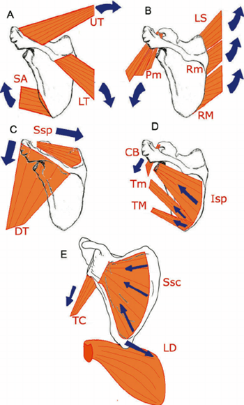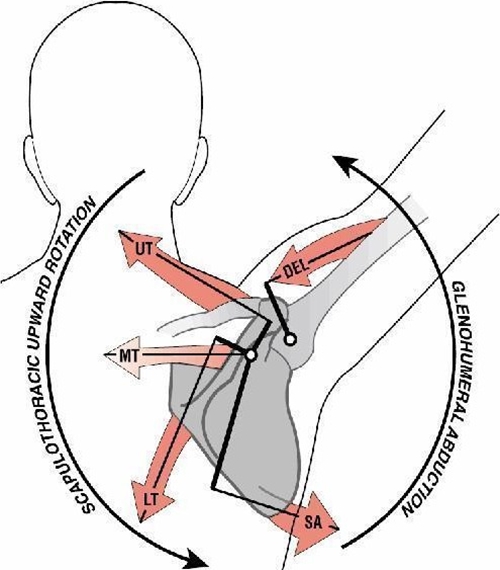 하방 회전(downward rotation)된 견갑골 위치(scapula position)는 하방 회전근(downward rotator)에 원인을 물론 담고 있습니다. 이 부분에 대해서는 너무도 쉽게 유추할 수 있으니 자세히 언급하진 않겠습니다. 하지만 이와 더불어 초기 외전(initial abduction)이 삼각근(deltoids)에 의해 유발된다면, 다시 말해 견갑골(scapula)이 효과적으로 고정(fixation)되지 않은 상태에서 삼각근(deltoids)이 작용한다면, 이것은 견갑골 하방 회전(scapula downward rotation)의 유발과 같습니다. 팔(arm)을 들어 올리기 위해서 상방 회전(upward rotation)되지 않는 만큼 외전(abduction)되는 것이기 때문입니다. 이것은 상방 회전(upward rotation)과 외전(abduction) 간의 균형적이지 못한 관계에 의합니다. 물론 이 순간에도 하방 회전근(downward rotator)도 관여하고 있지만, 단순히 하방 회전근(downward rotator)의 단독적인 문제에 의해서만 견갑골 위치(scapula position) 이상이 발생되지 않는 것에 우리는 주목해야 합니다.