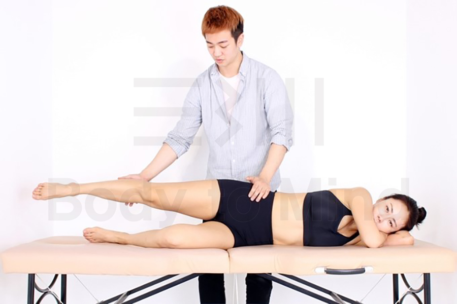 고관절 신전(hip extension)에 이어 고관절 외전(hip abdcution)을 이용한 움직임패턴검사(movement pattern test)입니다. 해당 검사는 촉진(palpation) 없이 대상자가 단독적으로 수행할 수 있지만, 위와 같은 부위들을 촉진(palpation)함에 따라 검사의 신뢰도를 향상시켜줄 수 있습니다. 하퇴(lower leg)를 잡은 이유는 굴곡(flexion) 및 신전(extension) 없이 순수한 외전 방향(abduction direction)만을 위해섭니다. 다른 한 손(single hand)은 골반(pelvis)의 장골극(iliac spine)입니다. 두 부위는 명확하게 고정(fixation)하는 것이 아니라, 말 그대로 터치하고 있는 정도로만 촉진(palpation)하고 있으면 됩니다. 고관절에서 외전(hip abduction)이 발생되면 골반(pelvis)은 고관절이 외전(hip abduction)된 쪽으로 상승(elevation)됩니다. 이때 상승(elevation)의 정도는 약 20˚입니다. 물론 고관절 외전 범위(hip abduction ROM)는 정상 관절가동범위(normal ROM)인 약 45˚를 기준으로 하지만, 정상 범위(normal range)가 불이행되더라도 골반(pelvis)의 과도한 상승(hyper elevation)은 양성 반응(positive reaction)입니다.