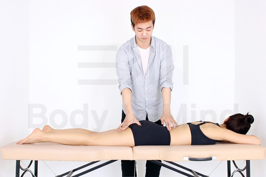 대상자가 고관절 신전(hip extension)을 수행하는 동안, 세 가지 영역을 촉진(palpation)해야 합니다. 이곳은 각각 척추기립근(erector spinea), 대둔근(gluteus maximus), 햄스트링(hamstring)입니다. 움직이기 이전부터 해당 근육(muscle)들을 촉진(palpation)하여 유지시킨 뒤, 대상자가 고관절 신전(hip extension)을 수행합니다. 이때 세 가지의 각 영역에서 어디가 먼저 활성화(activation)되는지가 포인트입니다. 가장 이상적인 움직임패턴검사(movement pattern test) 결과는 대둔근(gluteus maximus)이 최우선적으로 활성화(activation)되거나, 또는 어디가 먼저인지 헷갈릴 정도로 모든 부위들이 동시에 활성화(co-activation)되는 것입니다. (이에 대해서는 전문가마다 의견이 분분하지만 가장 보편적인 의견입니다.)