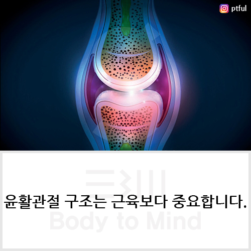 중요한 것은 윤활관절 구조(structure of synovial joint)는 근육 구조(muscle structure))보다 중요합니다. 근육(muslce)은 골격(skeleton)의 형태와 쓰임에 맞게 부착(attachment)되고 발달되면서 그 형상을 달리 합니다. 가동관절(movable joint)은 안정성(stability)이 부동관절(immovable joint)에 비해서 상대적으로 취약하지만, 그것은 근육(muscle)이 대신합니다. 우리가 근육(muscle)에 대해서 보편적으로는 움직임(movement)의 기능(function)만을 최우선적인 기능(function)으로 꼽지만, 동적 상태(dynamic condition)보다는 정적 상태(static condition)에서의 기능(function)을 먼저 수행하는 것이 우선입니다. 근육(muscle)은 우리에게 동적 안정자(dynamic stabilizer)로 알려져 있지만, 근육(muscle)은 특성상 수축성(contractibility)과 탄력성(elasticity)으로 인해 정적 상태(static condition)에서도 장력(tension)을 발휘합니다. 물론 인대(ligament)나 근막(fascia)과 같이 강력한 장력(tension)은 아니지만, 근육(muscle)은 그 넓은 부피(volume)와 면적(area), 그리고 개수로 무시하지 못할 만큼 정적으로도 안정성(static stability)을 발휘합니다. 그리고 지극히 당연스럽게도, 이것은 윤활관절(synovial joint)이기 때문에 확보시켜야 하는 능력이 불충분할 때, 그럴수록 근육(muscle)으로 비워진 능력을 보충하려 합니다. 따라서 신체의 각 부위별 윤활관절(synovial joint)에 대해서, 해당 관절마다의 고유한 구조(structure)와 특징을 이해할 수 있다면, 해당 관절(tissue)을 경유하는 근육(muscle)에 대해서도 구조적 및 기능적 특성(structural & functional characteristic)을 파악할 수 있는 것입니다.