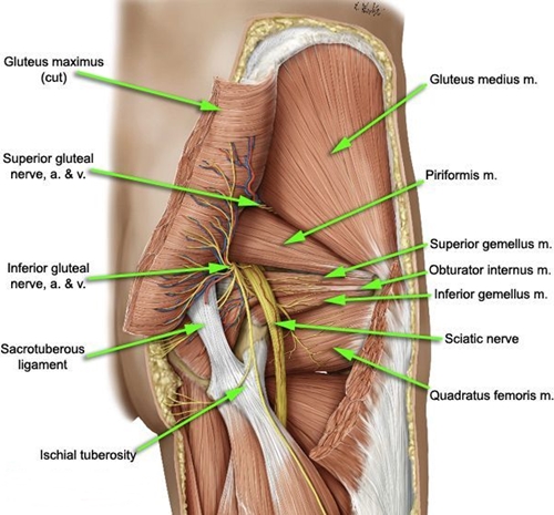 좌골신경통(sciatic neuralgia)은 천장관절(sacroiliac joint)의 틀어짐이나, 이상을 포함한 심부외회전근(deep external rotators)을 제외하고서라도 골반(pelvis)을 넓고 강하게 감싸주는 둔근(gluteus)의 부피(volume)가 감소되고 탄력성이 약화(elasticity weakness)되는 데에서 기인합니다. 둔근이 약화(gluteus weakness)될수록 심부외회전근(deep external rotators)은 둔근의 기능(gluteus function)을 대신하게 되고, 이것은 심부외회전근(deep external rotators) 중에서도 둔근(gluteus)과 가장 구조적으로 흡사한 이상근(piriformis)이 협력근(synergist)으로써 그 역할을 더 많이 발생시키게 됩니다. 결국 이상근(piriformis)은 처음에 소개한 유착(adhesion)이나 잦은 마찰력(friction force)의 결과로 하지(lower limb)로 길게 뻗어나가는 좌골신경(sciatic nerve)을 건드리고 포착시키게 됩니다.