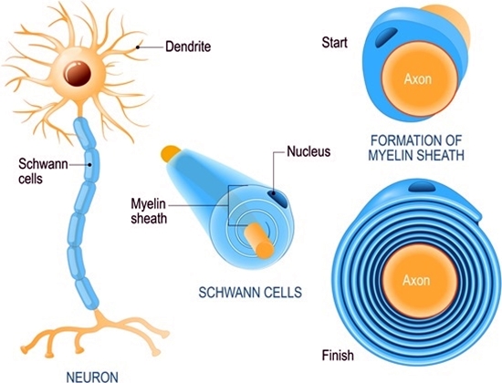 제가 전하고픈 중요한 이야기는 이제부터입니다. 위의 사진과 같이 축색돌기(axon)가 몸통(cell body)으로부터 뻗어 나올 때, 돌기의 가장 끝지점에는 축색종말(axon terminal)이 존재합니다. 이때 축색돌기(axon)는 수상돌기(dendrite)보다 그 길이(length)가 상대적으로 길기 때문에, 상대적으로 손상(injury)에 취약합니다. 게다가 신경(nerve)은 기본적으로 전기적인 신호(electrical signal)로 기능(function)을 발휘하는데, 길이(length)가 길기 때문에 그만큼 전기적인 신호(electrical signal)를 이동시키는 데에 있어서도 좀 더 시간이 소요될 수밖에 없습니다. 우리 몸은 이와 같이 하나의 구조물(structure)이 지니고 있는 취약성에 대해서 보완책이 언제나 존재합니다. 방금 언급한 축색돌기(axon)의 취약성에 대해서는 미엘린수초(myelin sheath)가 보완합니다. 미엘린수초(myelin sheath)는 축색돌기(axon)를 감쌉니다.