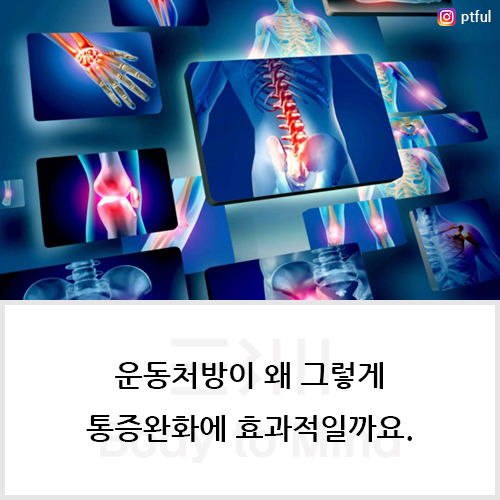 운동처방(exercise prescription)이 왜 통증완화(pain relief)에 그렇게나 효과적인 것이, 바로 지금까지의 이야기로 인해 비롯됩니다. 운동신경(motor nerve)이 통증(pain)을 느끼게 하는 신경(nerve)보다 빠르기 때문에, 운동신경(motor nerve)을 더욱 활성화(activation)시킬수록 통각신경세포(nociceptive nerve cell)를 앞설 수 있게 됩니다. 그 결과, 뇌(brain)에서는 서로 다른 지점에서 오는 여러 정보(information)들을 동시에 받아들이는 데에는 한계가 있기 때문에, 운동신경(motor nerve)의 피드백(feedback)이 압도적으로 많아질수록 상대적으로 통각신경세포(nociceptive nerve cell)로 인한 피드백(feedback)은 감소되는 것입니다. 특히나 뇌(brain)는 반복적으로 수반되는 안전한 정보(safe information)에 적응(adaptation)되기 마련입니다. 그러니 운동처방(exercise prescription)이 대상자의 통증완화(pain relief)에 도움이 될 수 있는 다양한 요소들을 충분히 갖추고 있다면, 해당 운동을 수행하는 과정을 통해서 운동신경(motor nerve)의 피드백(feedback)을 더욱 강화시킬 것입니다. 뇌(brain)는 계속해서 이쪽으로 더 많은 기능(function)을 발휘하게 된다는 것입니다. 결국, 이러한 과정을 통해서 통증완화(pain relief)가 이루어질 수 있습니다. 그래서 우리가 간혹 특정 운동을 수행한 뒤에, 평소에 느껴지던 불편함(discomfort)이나 통증(pain)과 비슷한 것들이 감소하거나 사라졌던 이유가 바로 이것이었습니다.