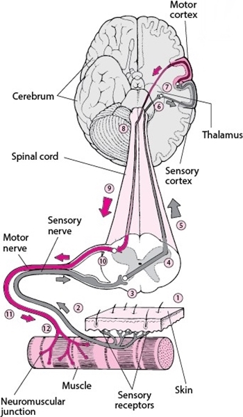 우리는 이미 미엘린수초(myelin sheath)가 신경(nerve)의 전기적인 신호(electrical signal)를 빠르게 이끌어낸다는 사실을 배웠습니다. 그러니까 미엘린수초(myelin sheath)로 감싸져 있지 않은 통각신경세포(nociceptive nerve cell)는 그 속도가 상대적으로 느립니다. 이것은 매우 중요한 사실입니다. 신경(nerve)의 전기적인 신호(electrical signal)가 빠르다는 것은 뇌(brain)까지 도달하는, 그리고 뇌(brain)로부터 이동하는 속도가 빠르다는 것인데, 통각신경세포(nociceptive nerve cell)는 반대로 그만큼 상대적으로 느리다는 것입니다. 여기에서 핵심은 뇌(brain)에는 동시다발적으로 수많은 뉴런(neuron)들에 의해서 정보가 수용된다는 것입니다. 그러니까 근육세포(muscle cell)로부터, 그리고 통각신경세포(nociceptive nerve cell)로부터 들어오는 신호(signal)는 수시로 들어오게 됩니다. 이때 먼저 특정한 신호(specific signal)가 먼저 들어오게 되면, 그 다음에 들어오게 되는 일련의 신호(signal)들은 해당 신호(signal)가 머물게 되는 공간은 그만큼 줄어듭니다. 뇌(brain)에 신호(signal)가 먼저 도달한다는 것, 그러니까 이것은 뉴런(neuron)의 속도가 빨라야만 가능한 이야깁니다. 결국, 미엘린수초(myelin sheath)로 감싸져 있지 않은 통각신경세포(nociceptive nerve cell)는 다른 신경세포(nervous cell)에 비해 느리기 때문에 뇌(brain)에 도달하는 속도도 그만큼 느리고, 뇌(brain)에 머물게 되는 공간(space)도 그만큼 좁은 것입니다. 이것을 운동처방(exercise prescription)에 이용한다면 통증완화(pain relief)에 효과적으로 활용될 수 있습니다. 이것이 신경억제(nervous inhibition)입니다.
