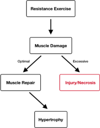 근육의 발달(muscle development) (정확히는 근육(muscle)의 횡단면적 증가), 근비대(myopachynsis)를 가능하게 만드는 요소에는 굉장히 많은 요인들이 필요합니다. 그중 하나만 언급하자면, 운동을 수행하는 과정에서 얼마나 직접적으로 근육에 손상(muscle injury)이 가해졌는지에 대한 부분입니다. 근육(muscle)이 사용될수록 에너지도 소비(energy consumption)되지만, 그 과정에서 근섬유(muscle fiber) 가닥 하나하나들이 데미지를 입게 됩니다. 그리고 그렇게 물리적인 스트레스와 미세손상(micro injury)을 당한 뒤, 회복(recovery)을 위한 과정에서 근육(muscle)은 더 강한 조직(strong tissue)으로 변모하게 됩니다. 이것은 이전의 자극(stimulation) 및 손상(injury)을 통해, 근육 조직(muscle tissue)을 더 강력하게 복구시키려는 회복 기전(recovery mechanism)의 일환으로써 발생되는 현상입니다. 이 과정에서 운동 중 근육경련(muscle spasm)이나, 운동 후 근육통(muscle pain)과 같은 몇 가지 증상을 겪기도 하지만, 그것이 과도한 역치(threshold) 이상의 수준이 아닌 경우에는 유스트레스로 작용하여 유의미한 근육의 발달(muscle development)을 일으키게 됩니다.