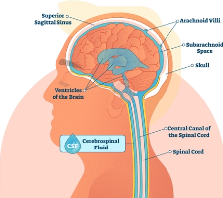 뇌척수액(cerebrospinal fluid)(cerebrospinal fluid, CSF)는 중추신경계(central nervous system)에 존재할 때, 특정한 구조(structure) 내에 위치하고 있습니다. 중추신경계(central nervous system)는 기본적으로 세 겹의 막(membrane)으로 덮여져 있는데, 그중에서 연막(pia mater)과 거미막(arachnoid) 사이에 채워져 있습니다.