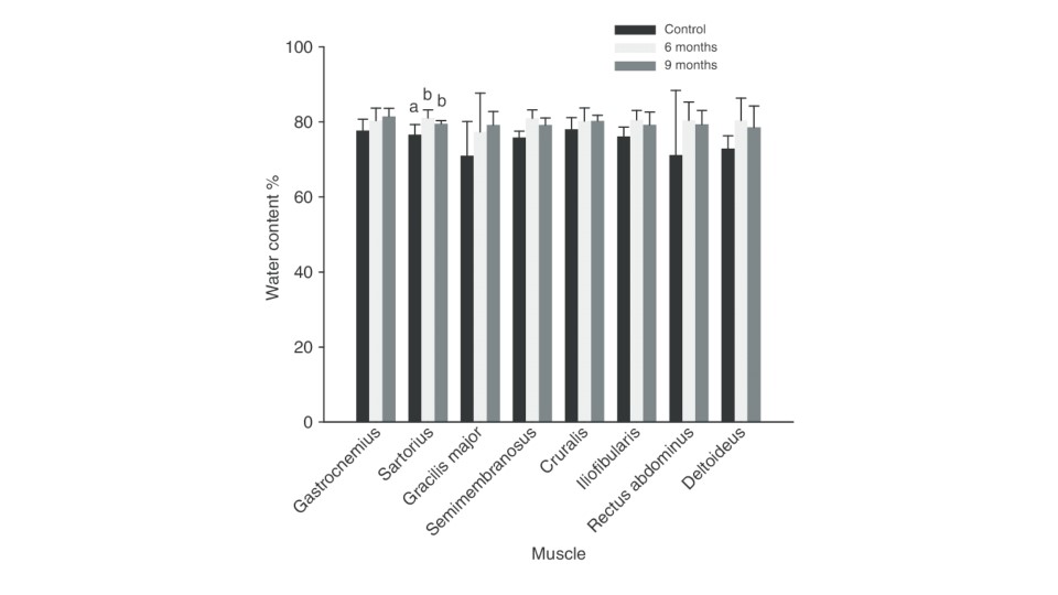 근육(muscle)은 우리가 알고 있는 것처럼 다량의 수분(water)을 함유하고 있습니다. 심지어 근육(muscle) 내에 글리코겐(glycogen)이 저장(storage)될 때조차, 글리코겐(glycogen) 저장량(storage)의 3배에 달하는 수분(water)을 끌어들여 저장(storage)하게 됩니다. 그만큼 근육(muscle)은 인체를 구성하고 있는 여러 조직(tissue)들 중에서 대단히 많은 수분량(water)을 함유하고 있습니다. 이것은 대단히 중요한 사실입니다. 바로 이러한 이유로 근육(muscle)이 우리보다 훨씬 늦게 늙기 때문입니다.
