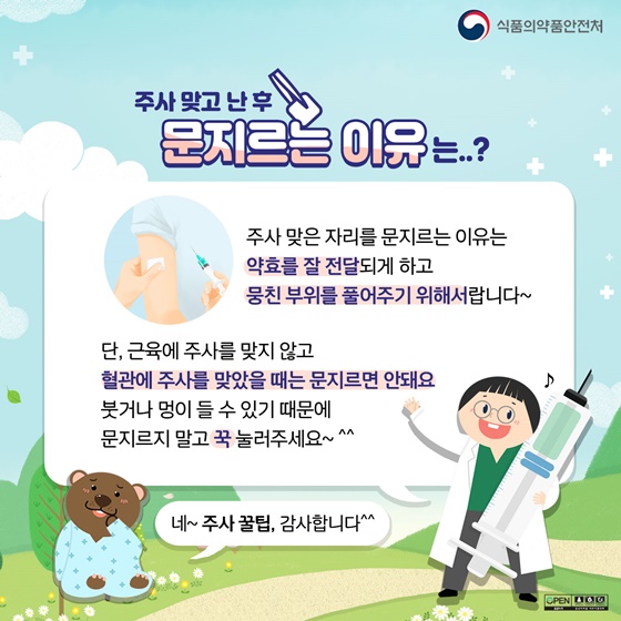 본래 근육주사(intramuscular injection)는 접종(inoculation) 후 문지르는 것으로 알려져 있다.