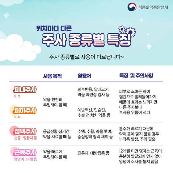 우리가 접종(inoculation)하고 있는 모든 백신(vaccine)은 근육주사(intramuscular injection)다.