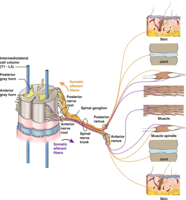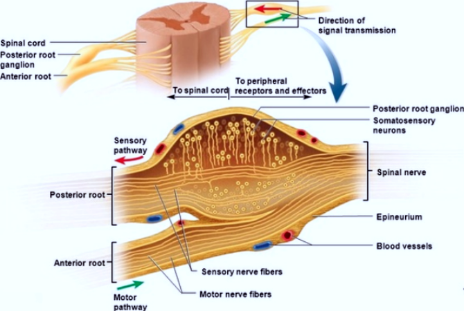 비록 신경(nerve)이라는 표현이 추상적인 개념을 무수히 내포하고 있을지라도, 이러한 표현들 이전에 실제 구조상(structure)으로 신경(nerve)은 관찰됩니다. 운동신경(motor nerve)과 감각신경(sensory nerve) 역시 그렇습니다. 이들은 척추(spine)의 추간공(intervertebral foramen) 내부에 자리 잡고 있는 척수(spinal cord)로부터 파생되는데, 여기에서부터 파생되는 척수신경(말초신경)(spinal nerve)은 앞부분(anterior)과 뒷부분(posterior)에서 서로 다른 경로(pathway)로 나누어집니다. 이때 이들이 나눠지는 경로(pathway)에 따라 감각신경(sensory nerve)과 운동신경(motor nerve)이 달리 컨택(contact)됩니다. 척수신경(spinal nerve) 중 척수후근(posterior root of spinal cord)에서부터 비롯되는 신경(nerve)은 감각신경(sensory nerve)입니다. 반면, 척수신경(spinal nerve) 중 척수전근(anterior root of spinal cord)에서부터 비롯되는 신경(nerve)은 운동신경(motor nerve)입니다.