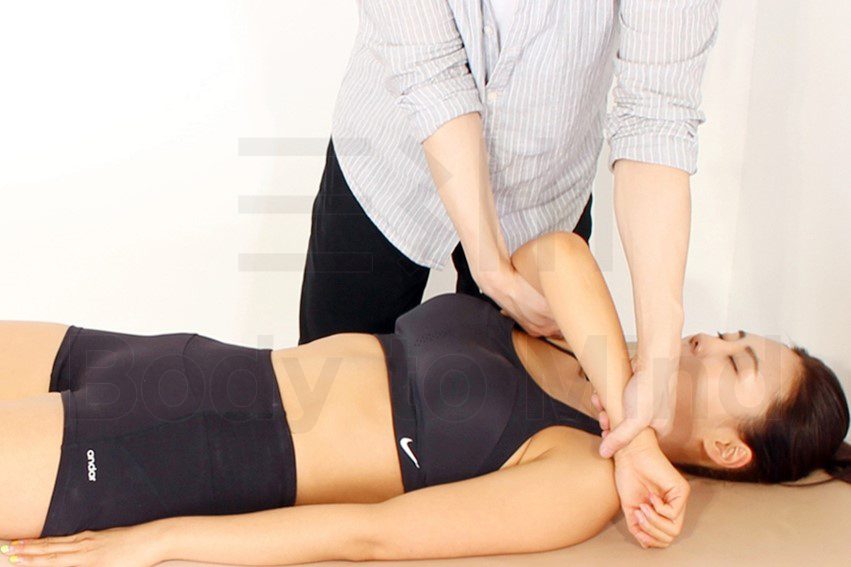 이번 검사(test)는 방금 전에 소개한 검사(test)보다 더욱 간단합니다. 대상자의 팔꿈치(elbow)와 어깨(shoulder)를 외전(abduction)시킨 상태에서 한 손(single hand)을 주먹(fist)을 쥐어 대상자의 상완골두 뒤쪽(posterior of humus head)에 가까이 위치(position)시킵니다. 이때 주먹 쥔 손(fist hand)은 편안하게 지면(ground)에 고정(fixation)만 시키고 있는 상태에서, 나머지 한 손(other of single hand)으로는 대상자의 팔꿈치(elbow)를 하방(inferior)으로 압력(compression)을 가하면 됩니다. 당연히 끝범위(end range)에서 과압력(over compression)을 주는 만큼 너무 큰 압박력(compression force)이 생성되지 않도록 주의해야 하며, 이것을 다른 방법으로 응용한다면 한 손(single hand)으로는 팔꿈치(elbow)에 과압력(over compression)을 준 채로 고정(fixation)시킨 상태에서, 주먹 쥔 손(fist hand)을 느슨하게 쥐다가 꽉 쥐다가를 반복하는 방식으로도 해당 검사(test)를 수행할 수 있습니다.
