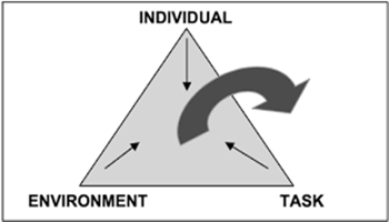 운동(training)은 기본적으로 움직임(movement)과는 다르기 때문에, 운동(training)을 수행하는 과정에서 우리가 맞이하게 되는 환경(environment)은 첫 환경(environment)의 경험이라고 할 수 있습니다. 그러니까 이때 당시에는 동적시스템이론(dynamic system theory)에서 이야기하는 능력(ability)을 수행해내기에, 인체는 그러한 형태로 발달(development)되지 않은 상태입니다. 하지만 운동(training)이 진행될수록 (운동(training)이 비교적 반복적인 환경 상황(environmental situation)에서 진행되는 만큼) 동적시스템(dynamic system)을 구현해내기 위한 능력(ability)이 점차적으로 함유된다는 것입니다. 그러나 이것은 이러한 과정을 거치게 되는 운동(training) 또한 하나의 동작으로만 수행되는 것은 동적시스템(dynamic system)을 구현할 수 없음을 강조합니다. 이것은 동적시스템(dynamic system)을 구현하기 위해서는 반복된 훈련(repeated training) 경험이 수반되어야 하지만, 그러한 과정을 거치게 되는 환경 상황(environmental situation)이 운동(training) 자체적으로 봤을 때 매번 같은 모션(motion)이어서는 안 된다는 것을 의미합니다. 그렇지 않고서는 환경(environment)이 동적으로 학습(learning)되지 않기 때문입니다. 최대한 다양한 모션(motion), 그러니까 다양한 변수들을 지니고 훈련(training)을 수행해야만 동적시스템(dynamic system)이 적절히 구현되기 위한 능력(ability)이 발달(development)되는 것입니다.
