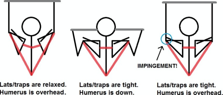 앞서 이야기했던 긍정적인 요인들은 말 그대로 숄더패킹(shoulder packing)을 효과적으로 수행했을 때를 원칙으로 합니다. 오히려 잘못된 숄더패킹(faulty shoulder packing), 그러니까 너무 과도한 숄더패킹(hyper shoulder packing)은 어깨움직임(shoulder movement)을 발휘하는 상황에서 과도하게 견갑골(scapula)을 제한(limit)시키게 됩니다. 이것은 견갑상완리듬(scapulohumeral rhythm)을 강렬하게 파괴(destruction)시킵니다. 예를 들어 팔(arm)을 들어 올린 상태(flexion)에서 신전 및 내전 움직임(extension & adduction movement)을 수행한다고 했을 때, 해당 움직임(movement)의 시작 자세(starting posture)에서부터 숄더패킹(shoulder packing)이 너무 강하게 시도된다면, 견갑골(scapula)은 완전하게 상방회전(upward rotation)되지 못한 채 상완골(humerus)만 과도하게 굴곡 및 외전(hyper flexion & abduction)될 것입니다. 이것은 동일하게 어깨(shoulder)에서의 가동범위(range of moion)를 발휘했을 경우, 비정상적으로 과도하게 상완골(humerus)만 보상적으로 움직임(compensative movement)에 동원(recruitment)된 채 운동(training)을 수행하는 것과 같습니다. 그리고 이러한 상황은 과도하게 견갑골(scapula)의 움직임(movement)이 제한된 상태(limited condition)로 상완골(humerus) 위주로 움직이려 하다 보니, 어깨(shoulder)에서 가장 취약한 장소인 견봉하공간(subacromial space)은 그만큼 더 많이 좁아질 것이고, 구조물(structure)들이 쉽게 충돌(collision)될 가능성도 대단히 높습니다.
