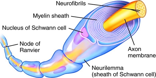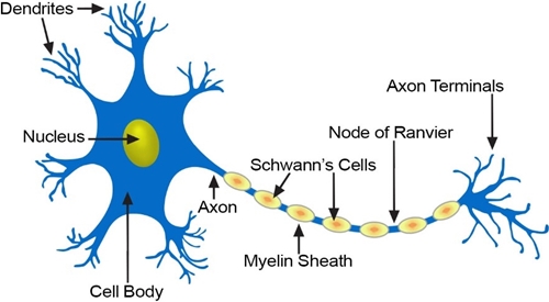 신경(nerve) 내에서 발생하게 되는 자극(stimulation)은 전기적인 자극(electric stimulation)입니다. 그리고 이 전기적인 자극(electric stimulation)은 수상돌기(dendrite)에서 받아들이고(input), 축삭돌기가 전달하기(output) 때문에 일종의 전선으로 비유할 수 있습니다. 더욱이 전선과 흡사하다고 할 수 있는 것은 축삭돌기(axon)에는 수초(myelin sheath)라고 하는 세포(cell)가 감겨 있습니다. 수초(myelin sheath)를 통해서 한 방향으로만 빠르게 전기적인 신호(electric signal)를 전달할 수 있으며, 수상돌기(dendrite)에 비해 길게 형성된 축삭돌기(axon)를 보호하며, 돌기를 감쌈으로써 전기(electricity)가 통하지 않는 절연체(insulator)의 역할도 지니고 있습니다.