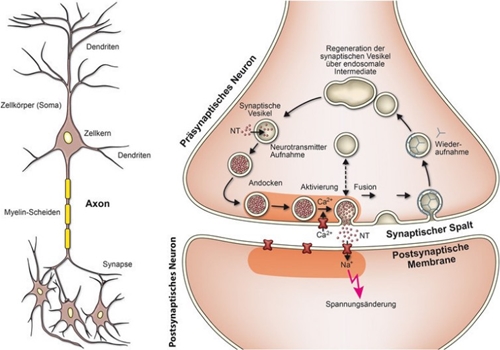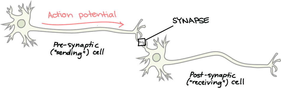 시냅스(synapse)라는 공간의 형성으로 전기적인 신호(electric signal)를 보낼 수 없으니, 뉴런(neuron)은 그 대신에 화학적인 신호(chemical signal)를 통해 자극(stimulation)을 전달합니다. 전기적인 신호(electric signal)가 시냅스(synapse)까지 도달하게 되면, 신경전달물질(neurotransmitter)이 함유된 소포(parcel)가 시냅스(synapse) 표면(surface)까지 운반되어 그 안에 내재된 신경전달물질(neurotransmitter)을 시냅스 간극(synapse gap)에 방출하게 됩니다. 이를 통해 자극(stimulation)을 받아들이게 되는 뉴런(neuron)쪽의 수용체(receptor)에 신경전달물질(neurotransmitter)이 결합함으로써, 전기적인 신호(electric signal)가 전달되는 것입니다.