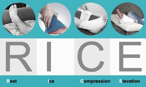 Ice : 얼음 또는 차가운 수건과 같은 것으로 냉찜질을 하여 더 큰 붓기(swelling)와 염증(infection)의 가능성 감소시킵니다. 너무 차갑지 않게 하기 위해 옷 위에, 혹은 수건으로 감싼 뒤에 10~20분가량 찜질합니다. 냉찜질은 임상적으로 손상(injury) 직후 24~48시간이 경과할 때까지 주기적으로 수행하는 것이 좋습니다.