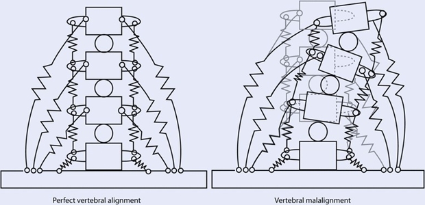 움직임 동안 추간판(disc)들이 체중 부하(weight bearing)와 스트레스를 충분히 완충시키지 못하니 척추 피로도(spinal fatigue)는 점차적으로 증가하게 되며, 이는 다양한 퇴행성 질환(degenerative condition)과 통증(pain)을 부추길 수 있습니다. 게다가 원활하지 못한 개별적인 추체(spinal body)들의 움직임으로 인해 체간(trunk)의 가동성(mobility), 더 나아가서는 모든 관절(joint)에서의 가동성(mobility)이 제한될 수 있습니다. 구조(structure)와 만곡(curve)이 정상(normal)에서 변형(modify)되었으니, 정상적인 근력(normal strength)을 발휘할 수 없고 감각수용기(sensory receptor)가 저해되어 안정성(stability)의 요소에도 결함이 발생됩니다. 이러한 과정들이 지속적으로 누적된다면, 그 피해의 영역은 척추(spine)를 벗어날 것입니다.