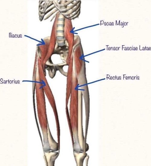 첫 번째는 고관절(hip joint) 굴곡근(flexor)으로 대퇴부(thigh) 전면(anterior)에 해당되는 대퇴근(thigh muscle)이며, 대표적으로 장요근(iliopsoas)과 대퇴사두근(quadriceps femoris)이 존재합니다.