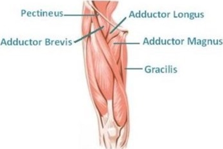 내전근(adductors)은 총 다섯 가지의 골격근(skeletal muscle)으로 이루어져 있으며, 이들은 각각 치골근(pectineus), 단내전근(adductor brevis), 장내전근(adductor longus), 대내전근(adductor magnus), 박근(gracilis)가 됩니다. 동시에 모든 내전근(adductors)들은 내회전(internal rotation)을 작용할 수 있습니다. 내전근(adductors)보다 보다 적은 힘이기는 하지만, 둔근(gluteus)의 일부 섬유도 내전(adduction)에 작용할 수 있습니다.