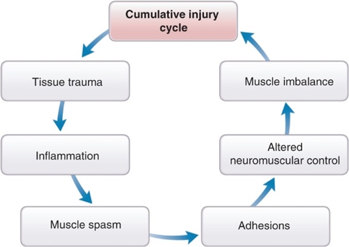 누적손상주기(cumulative injury cycle)는 미국스포츠의학회인 나즘(NASM)에서 강조하고 있는 기능장애로, 특정 요소들이 일련의 순서에 따라 주기적으로 악순환이 반복되어 근육 불균형(muscle imbalance)이 초래되는 것을 의미합니다. 따라서 근육 불균형(muscle imbalance)을 야기하는 원인 중 하나라고 볼 수 있습니다.
