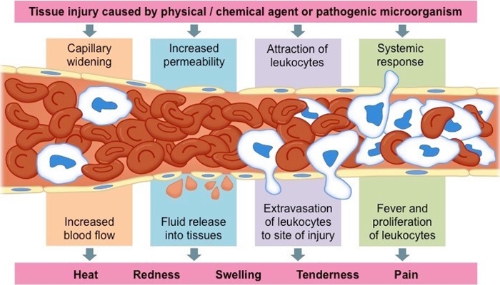 조직 외상(tissue trauma) 이후에는 염증이 발생됩니다. 염증(sprain)은 상해(injury)에 대한 대표적인 생체 방어반응(protection reaction) 중 하나로, 손상된 조직(injury tissue)을 회복(recovery)시키기 위해 자연스레 발생되는 증상입니다. 해당 지점의 혈관(blood vessel)을 확장시켜 더욱 많은 영양소(nutrient)와 항체(antibody)를 공급하며, 그로 인해 체온(temperature) 상승과 식균작용(phagocytosis)을 일으킵니다. 물론 이러한 과정에서는 너무 과도한 체온(temperature) 상승의 가능성과 부종(edema) 또한 동반될 수 있습니다. 이때 염증(inflammation)은 통증수용기(pain receptor)를 자극하여 통증(pain)까지 발현시킵니다.