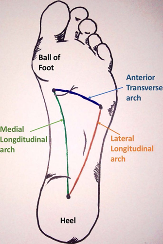 위의 그림을 통해서 완벽한 이해가 가능합니다. 뒤꿈치(heel) 중앙부(center)에 하나의 지점이 있고, 발(foot)에의 앞꿈치 양쪽에 하나씩 두 개의 지점이 있습니다. 모든 지점들을 기준으로, 하나의 지점으로 다른 지점으로 선이 그어지고 있는데, 이것이 바로 발(foot)에 존재하는 발아치(foot arch)를 표현한 선입니다. 뒤꿈치(heel)에서부터 엄지발가락(great toe)쪽의 앞꿈치로 이어지는 선이 '내측 종아치(medial arch)', 뒤꿈치(heel)에서 새끼발가락(little toe)쪽의 앞꿈치로 이어지는 선이 '외측 종아치(lateral arch)', 그리고 마지막으로 엄지발가락(great toe)쪽의 앞꿈치와 새끼발가락(little toe)쪽의 앞꿈치로 이어지는 선이 '횡아치(transverse arch)'입니다.