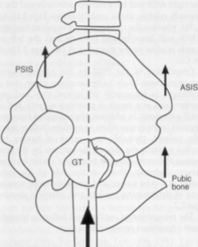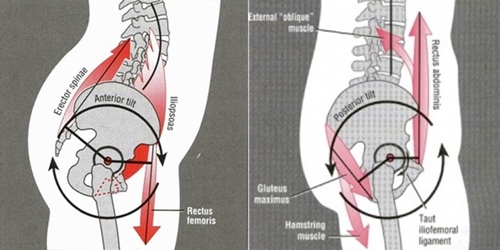 앞쪽기울임(anterior tilt)은 상대적으로 앞위엉덩뼈가시(ASIS)가 낮아지는 데에 비해 뒤위엉덩뼈가시(PSIS)는 높아지는 움직임입니다. 반대로, 뒤쪽기울임(posterior tilt)은 상대적으로 앞뒤엉덩뼈가시(ASIS)가 높아지는 데에 비해 뒤위엉덩뼈가시(PSIS)는 낮아지는 움직임입니다. 학문적으로 골반(pelvis)의 정상 중립 정렬(neutral alignment)은 각각의 엉덩뼈 가시(iliac spine)를 촉진했을 때, 앞위엉덩뼈가시(ASIS)가 뒤위엉덩뼈가시(PSIS)보다 약 3~4cm 가량 낮은 위치에 자리 잡히게 됩니다. 그러니 앞쪽기울임(anterior tilt)은 이 격차가 더욱 증가되는 것으로, 뒤쪽기울임(posterior tilt)은 더욱 감소되는 것으로 생각해도 좋습니다.
