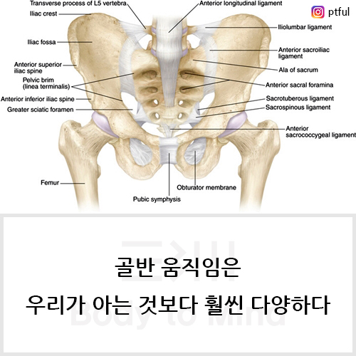 그렇다 보니 현장에서 많은 운동 지도자들이 어떤 종목의 운동이나 학문을 배우더라도, 골반 자세(pelvic posture)와 골반 움직임(pelvic movement)에 대해 많은 관심을 가집니다. 하지만 이 골반(pelvis)에 대해, 발생 가능한 움직임들이 무엇이 있는지 전부를 아는 경우는 드뭅니다. 일반적으로 배우는 골반 움직임(pelvic movement)에서는, 발생 가능한 모든 움직임을 다루지는 않습니다. 아마 그 이유는 골반만 놓고 봤을 때, 골반 움직임(pelvic movement) 자체가 큰 표현력으로 눈에 익혀지지 않는다는 것과 골반(pelvis)에 부착(attachment)된 수많은 근육들이 특정 움직임을 단독적으로 수행해내기에 충분한 모멘트를 지니고 있지 않기 때문일 것입니다. 게다가 다양한 움직임을 다루기엔 보다 복잡한 관점이 필요하고, 또 하나의 골반 움직임(pelvic movement)은 다른 골반 움직임(pelvic movement)과 연관되어있기 때문이기도 할 것입니다. 그렇다면 실질적으로 골반에서 발생 가능한, 일반적으로 알려진 움직임 이외의 어떤 움직임들이 존재할까요.